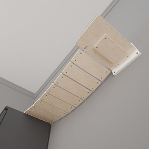 Made out of 18mm thick birch plywood, which makes it sturdy and heavy; when mounted properly, it can easily hold the weight of multiple large cats. They're simple suspension bridges, with two hard-bearing sisal or PP ropes carrying the bars. and following a hyperbolic curve, the CATenary. The curve is stiffened and made more stable by 4 screws on each bar (2 in every rope), ensuring that the bars stay in place. The stiffness allows the bridges to be more stable and to carry much more weight while reducing the twisting motion.