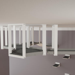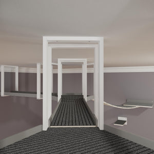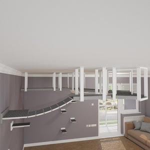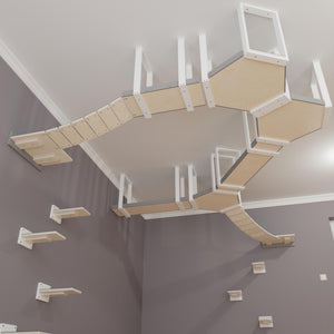 We created this visual to help you grasp the possibilities of using such cat furniture. We showcased how a WideBridge could be integrated into a ceiling mounted platform and continue onto a standard wall mounted shelf. How different lengths of Skyway platforms could look with a SkyHex. And how the SkyHexes could be stacked along one another to form a cool structure, a fun element up high.